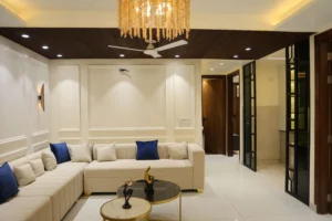 - Interior Work Finishes: All Rooms: Have Asian Royal washable Paint, All Rooms: Heavy False Ceiling with LED and COB Light Fittings (including drawing room), All Rooms: LED Panel up to full height, All Rooms: One Wallpaper/Wall Panelling work with PU polish/deco polish, All Rooms: Wardrobes (Almirah), All Wooden Work: Waterproof with commercial board usage, Other Rooms: POP (Plaster of Paris) finish, Top-Grade Interior Work Designed by ANSA (Market Top Leading Interior Company), All channel work Done by 'Home Deco' ; Sanmica on both sides of doors