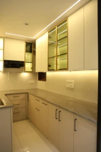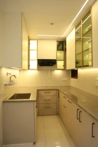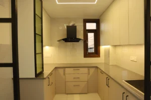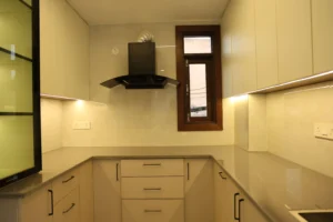 - Kitchen Work: Semi-Modular Kitchen with Electric Chimney (Brand: Carysil), Granite Slab, One Steel Sink, Kitchen Glazed Tiles: 2 ft height above slab, Kitchen Wood Box: Provided above slab only (2 ft 6 inches height with outside laminated mica)